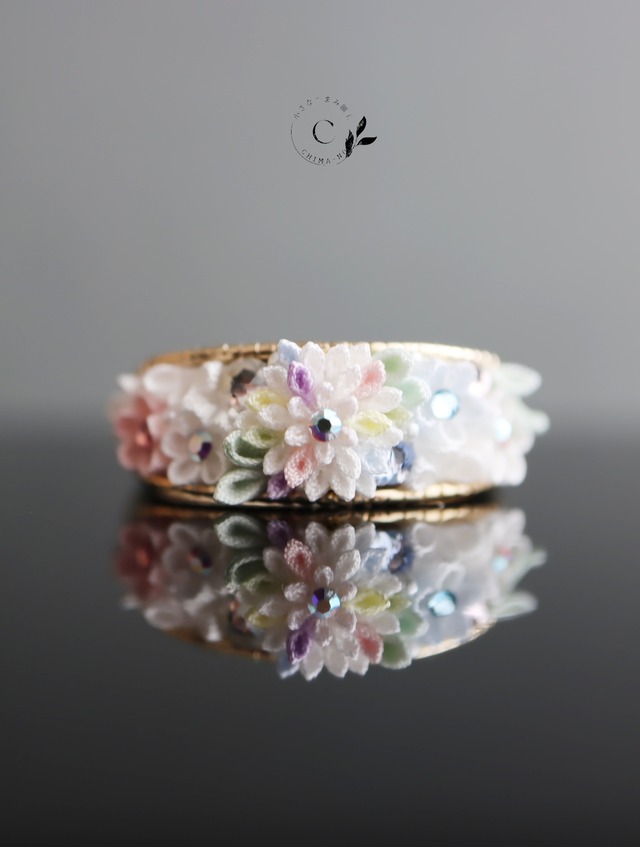 「希望」「常に前進」の花言葉を持つガーベラ。 花束の一部を切り取ったかのようにたくさんのお花を詰め込みました。 淡い色合いのストーンがさりげなく輝きます。 お花のモチーフだけれど可愛くなりすぎず。 手元で咲くお花が見るたびに心をほころばせてくれることを想い作りました。 ブランドロゴ入りオリジナルBOXとともにお届けいたします。 ・幅 約6mm(お花部分の内側 約4mm) ・内側の円周 約16cm ・手首脱着の開いた部分 約3cm 防水加工の薬剤を使用していますが「濡らして良い」とするものではございません。 繊細なつくりとなっておりますので、どうぞご留意のほどよろしくお願い致します。 <使用素材> ・メッキ金具 ・防水加工剤 ・生地硬化剤 ・絹生地 ・ガラスストーン ・アクリルパール ・接着剤