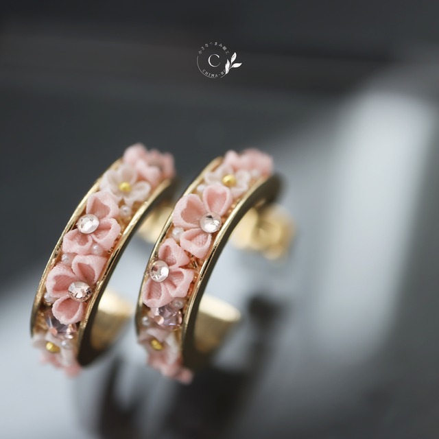 桜の花をふんだんに詰め込んだ作品です。 春が待ち遠しい日々。 お耳元に柔らかな春を身に着けられるよう小ぶりなイヤリングをご用意いたしました。 土台つまみ細工部分の幅は約7mm。 手にして見ると思った以上に小さな小さな桜です。 横から見ると半月のような形で小さいながらも立体感のある形状です。 角度が変わると桜の見え方も変わりますので、そのような表情の変化もお楽しみください。 オリジナルアクセサリーBOXに入れてのお届けとなります。 防水加工の薬剤を使用していますが「濡らして良い」とするものではございません。 繊細なつくりとなっておりますので、どうぞご留意のほどよろしくお願い致します。 <使用素材> ・金メッキ金具(土台) ・防水加工剤 ・生地硬化剤 ・絹生地 ・ガラスストーン ・アクリルパール ・接着剤