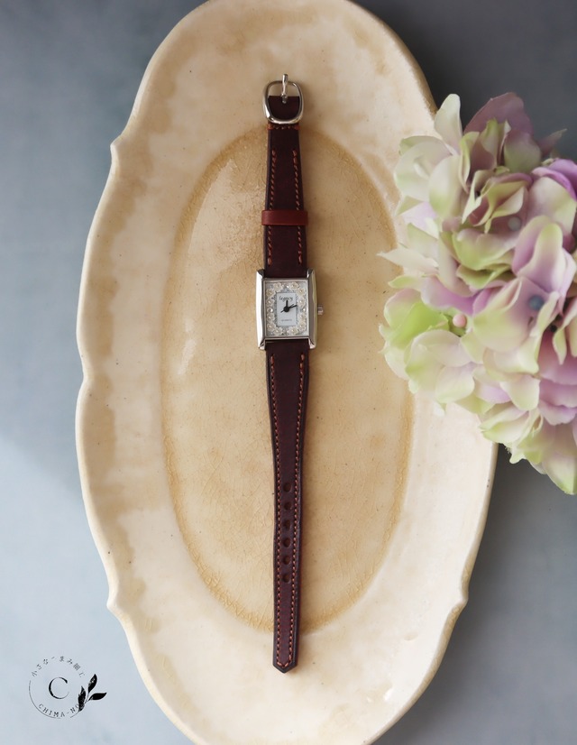革小物職人『cobalt leather works』様にベルトの制作をお願いしました。 希少価値の高い最高級イタリアンレザー(プエブロ)を使用し、縫い目のひと針まで丁寧に仕立てられています。 表の部分だけではなく、腕に当たる裏部分にも贅沢に高級皮革(ブッテーロ)のキャメル色を使用。 ※裏側部分についての雰囲気は丸型時計での画像もありますが、画像10枚目〜14枚目をご参照ください。 シンプルなデザインで無二の「相棒」として経年変化をお楽しみいただけます。 一人の職人が全工程を手作業で製作しています。 カラーは ペトロリオ/ネイビー/ダークブラウン/プルーニャ の4種類よりお選びください。 サンプルで制作したものはプルーニャを採用しています。 切り出しの部分や個体差、撮影環境やモニターの違いなど色味に違いがございます。 濃い部分/鮮やかな部分など指定はできませんのでご了承ください。 +++++++++++++++++++++ 文字盤に小花を咲かせた腕時計です。 革ベルトの上質感を存分に味わっていただけるよう、小花は白に統一しています。 ストーンもクリアで上品に輝きをお楽しみいただけます。 スクエア型と丸型では小花の大きさを変えたデザインにしています。 スクエア型ではよりスッキリとした印象に見えるよう、小花を小さく花数を増やしての配置です。 +++++++++++++++++++++ 【ウォッチヘッド】 ガラス面 約18mm×約14mm フェイス本体 約20mm×約20 (リューズは+2mm) ムーブメント MIYOTA製 シチズン時計株式会社が製造/販売している安心の製品です。 電池 RS626SW(パナソニック社製新品電池を入れてお届けいたします) 【ベルトサイズ】 手首に巻いた状態で14cm〜18cm程度の間に小穴が開いています。 「ベルトをもっと長く作って欲しい」というご希望がございましたら、『ベルト延長オプション(550円)もご一緒にご購入ください。 詳しくご相談させていただきます。 【納期について】 2〜3ヶ月程お日にちをいただきます。 受注生産であり、盤面もベルトもそれぞれ一人の作り手が行っておりますので、どうぞご理解のほどよろしくお願いいたします。 【ご購入後について】 ○保証 特に保証のご用意はありませんが、お手元に届いてから1週間以内に時計が止まってしまうような不具合がありましたらご相談ください。 ○電池交換 ホームセンターや時計店等でも簡単に電池交換ができる作りです。 送料はお客様ご負担になってしまいますが、Chima-noでも電池交換作業が可能です。 ○防水について 日常生活防水機能などには対応しておりません。 手を洗う際に一緒に濡らしてしまうことや汗など水分に濡れぬようお気をつけください。 ○金属部分の変色等劣化を避ける 使用後に乾いた柔らかい布で拭いたり、絡まないように保管するなど 普段のお手入れで日々の輝きは変わります。 【使用素材】 ・ウォッチヘッド ・絹生地 ・ガラスストーン ・金属メッキパーツ ・ブリオン ・革ベルト
