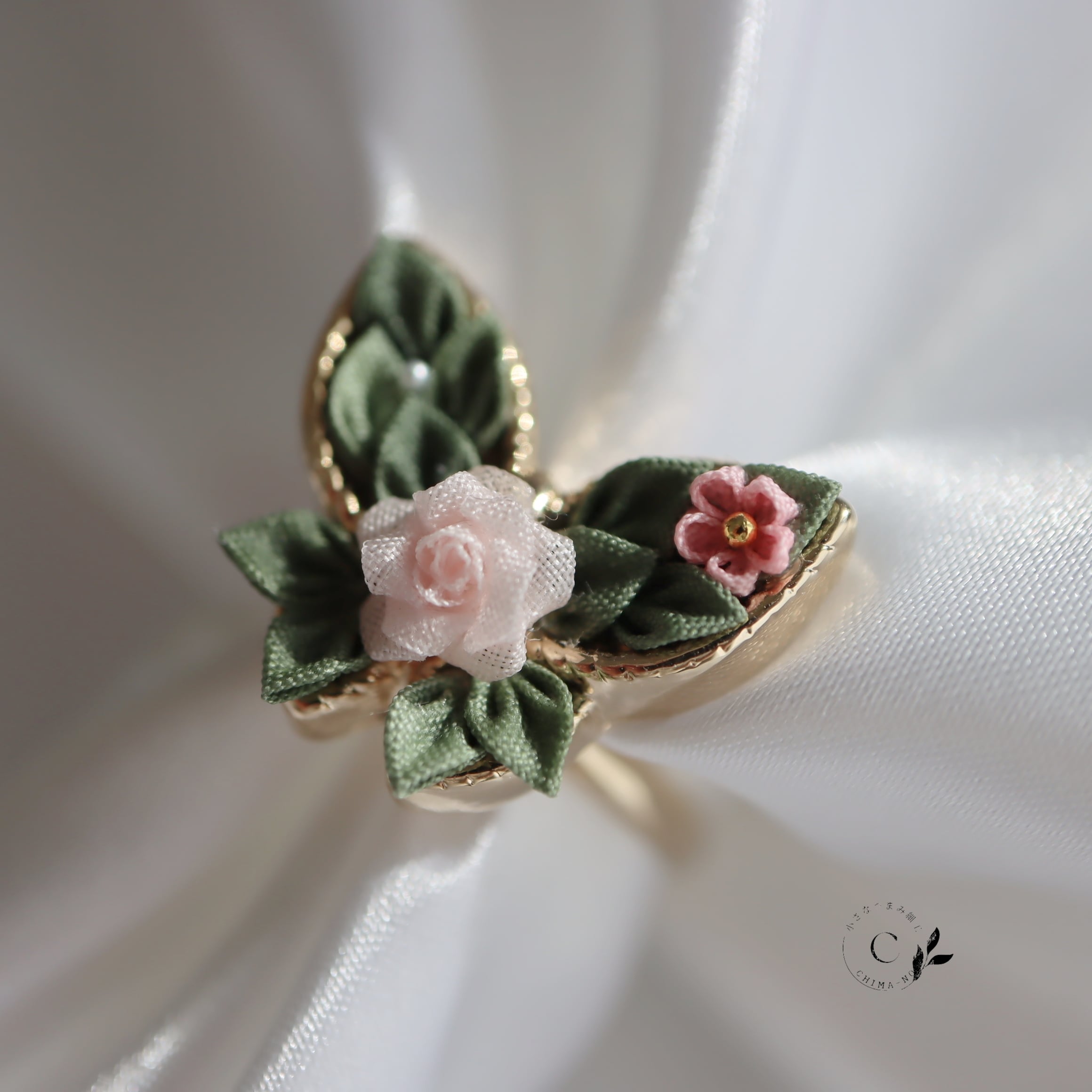葉に見立てた羽に小さなバラを乗せて華やかに。