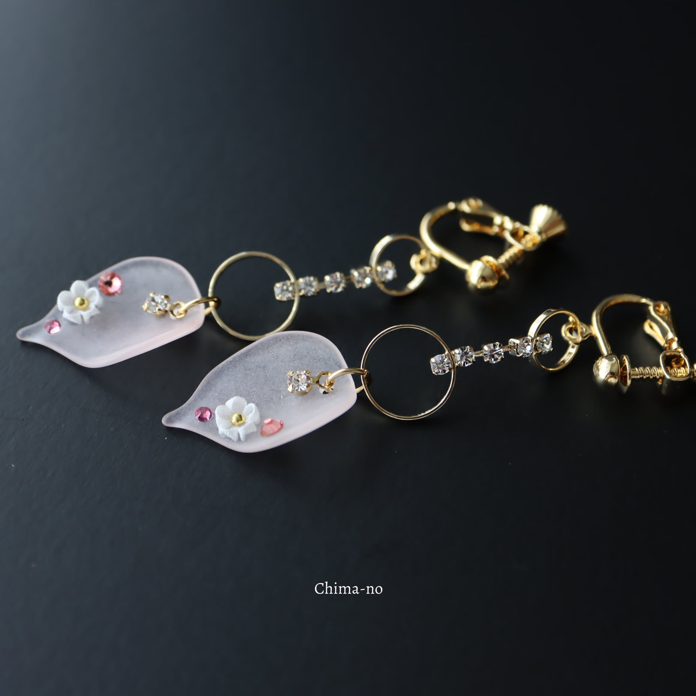 すりガラスのような花びら型のパーツに小花を一輪咲かせました。