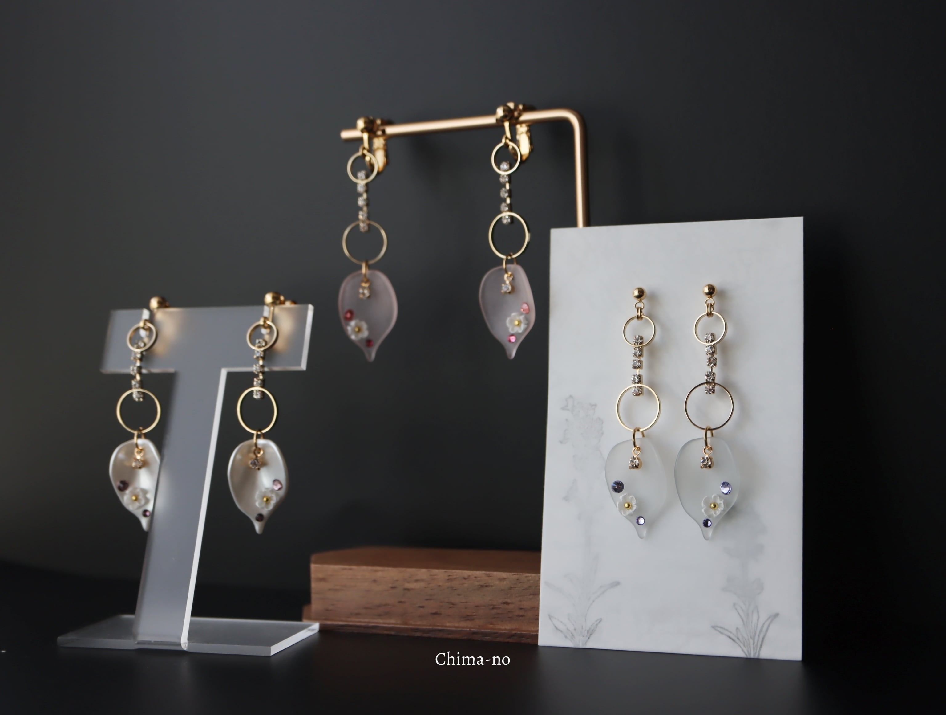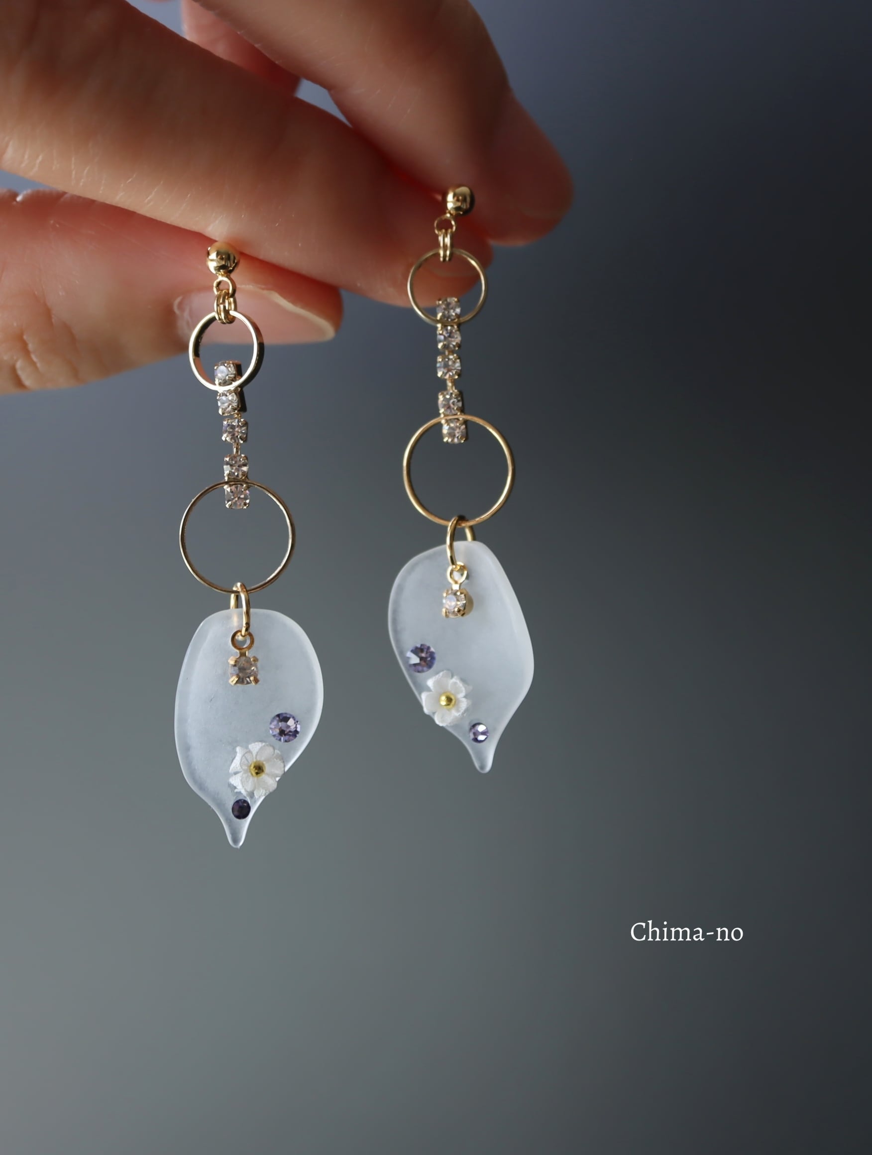 すりガラスのような花びら型パーツに小花を一輪咲かせました。