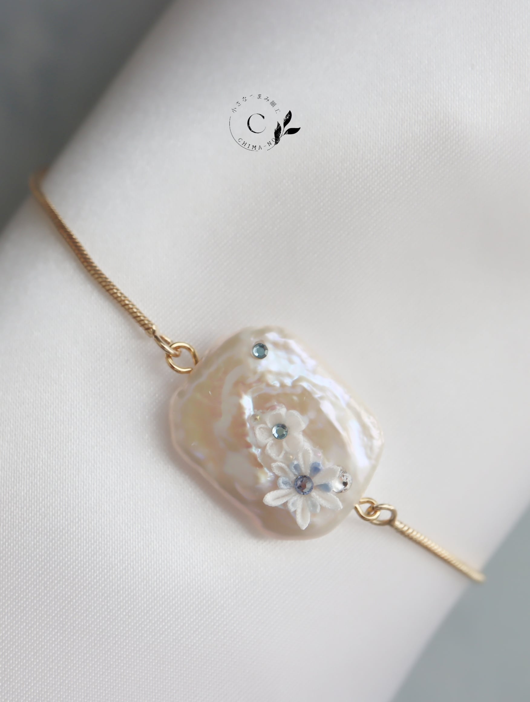 スクエア型の淡水パールに雪の花を咲かせました。